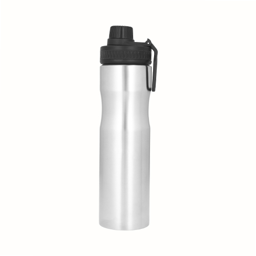 Cilindro de acero inoxidable con sujetador, tapa con cintillo de silicón y boquilla enroscable de plástico.
