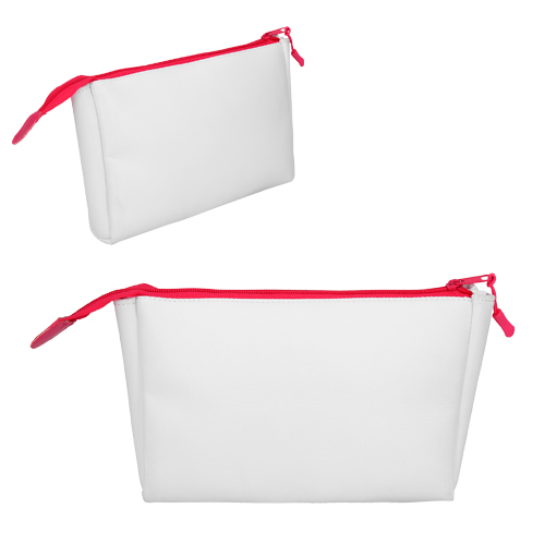 Cosmetiquera con forro, cierre de color y fuelle.
