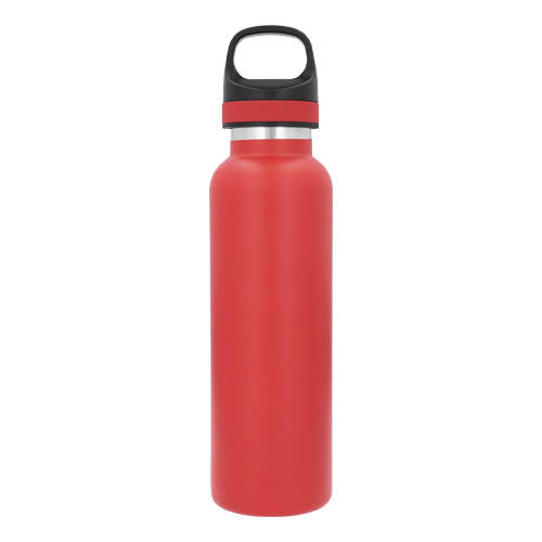 Termo con doble pared de acero inoxidable con tapa de plástico enroscable con cintillo de silicón y textura en el cuerpo.