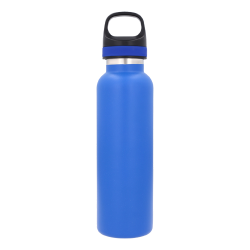 Termo con doble pared de acero inoxidable con tapa de plástico enroscable con cintillo de silicón y textura en el cuerpo.