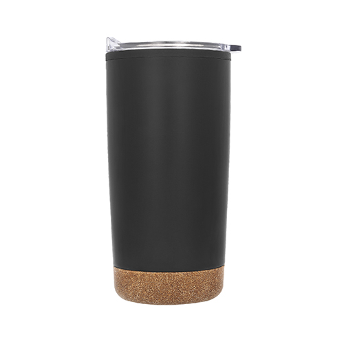 Termo con doble pared de acero inoxidable e interior de plástico, base de corcho, tapa traslúcida a presión con seguro deslizable y boquilla.