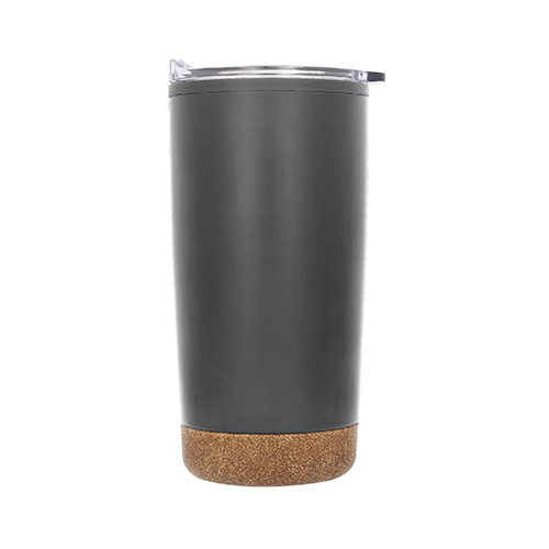 Termo con doble pared de acero inoxidable e interior de plástico, base de corcho, tapa traslúcida a presión con seguro deslizable y boquilla.