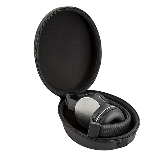 Audífonos Bluetooth plegables con función manos libres. Controles integrados de llamada, volumen y reproducción de audio. Incluye cable cargador, cable auxiliar y estuche.
