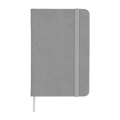 Mini libreta de poliuretano con 80 hojas de raya y banda elástica para sujetar cubierta.
