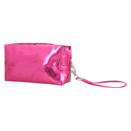 Cosmetiquera de PVC con acabado metálico, cierre, correa intercambiable y fuelle.
