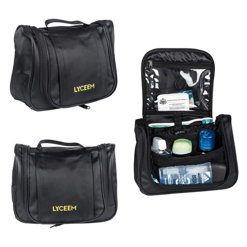 Práctico maletín de viaje con cierre, bolsa y asa frontal. Compartimentos de malla, porta objetos y gancho interno.